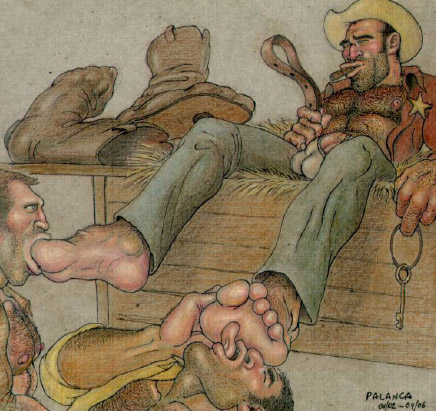 En un temprano dibujo de los años setenta, como parte de una serie de historietas, Pedro Santillana a.k.a. Pedro Palanca (1968-2014) creaba una escena donde un lloroso zorro aparecía siendo lamido en los pies por un animal amigo en una escena de despedida. Aun antes, había dibujado 7 adorado por chichis, con un surrealista “número siete” antropomorfizado de un sobredimensionado pie desnudo en una escena de crucifixión.