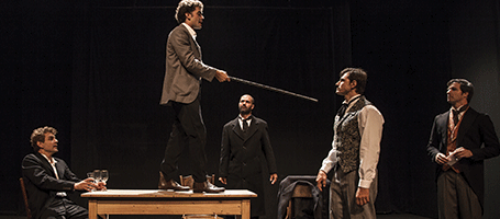 Con las impactantes actuaciones principales de Fabrizio Aguilar y Fernando Luque, quizá –nos arriesgamos a “opinar”- uno de los mejores actores de su generación. En Eclipse Total somos testigos de cómo Verlaine y Rimbaud construyen y deconstruyen su relación, vemos cómo progresivamente van cambiando los roles entre ambos: desde un inicio Rimbaud parece despertar cierta fascinación sobre Verlaine -casado con la adolescente Mathilde, rol interpretado por Ingrid Altamirano, precisa en la delicadeza y fragilidad proyectada-, quien ya gozaba de reconocimiento en el ámbito lírico y cultural de la época y quién inmediatamente decide sumergir al joven en el mundo de la poesía parisina. Por etapas dominante el mayor, poco a poco Rimbaud termina por ejercer un poder mayor sobre él, llevándolo incluso a depender de la relación establecida entre ambos. Nos sumerge en la época (1871 – 1892) no una cargada escenografía, sino la decisión de “destecnologizar”, en la medida de lo posible, los mecanismos para captar la atención del público: no hay grabaciones que invoquen a apagar celulares, la música es interpretada en vivo por Raúl Erazo (piano) y Jorge Sánchez (violoncello), y los cambios de escena son documentados, referidos y contextualizados por otros actores del elenco.