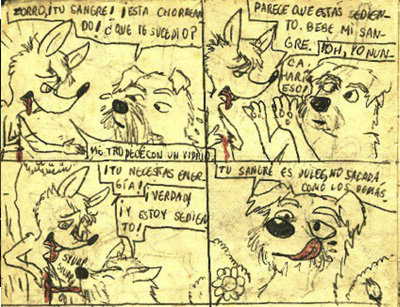 Pedro errante, pero también “Palanca”, que pareciera sugerir la erección y la diagonal que levanta, un dispositivo de apertura del ano clausurado del varón -pies torcidos lamiendo el ano- y en esa apertura la creación de tráficos deseantes que permiten la circulación desobediente de fluidos entre los cuerpos, fluidos que no son ajenos a su creación sino que constituyeron desde un inicio, parte de la intensidad y la vulnerabilidad de la vida trashumante de Pedro: flujos de intensos sabores a decir de su pequeña historieta de los años setenta donde un zorro herido le ofrece su sangre a un cansado y amoroso amigo, quien luego del succionador ceremonial le dice lo que también podríamos decirle a Pedro: “tu sangre es dulce” en el fluir intenso de torcidos pies que no saben a dónde van.